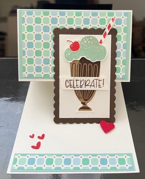 I love this Share A Milkshake Bundle by Stampin Up®. This is a easy easel card sure to brighten someone's day. I used the pretty Designer Series Paper that was free with the Sale-A-Bration promotion. This set includes stamps to make shakes, cones and sundaes. Super cute for any age. This would also make nice party invitations. Just one of the cards we will be creating at March stamp classes.